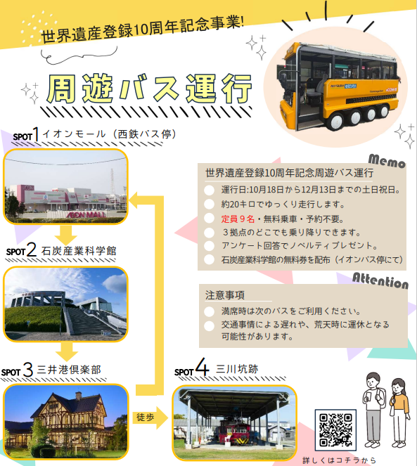 大牟田市では、世界遺産登録10周年を記念して、2025年10月18日(土)~12月13日(土)までの土日祝日限定で、石炭産業科学館、三井港倶楽部・三川坑跡を巡る「グリーンスローモビリティ」を運行しています。