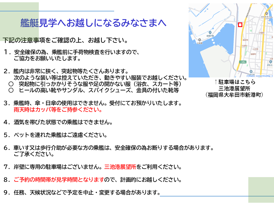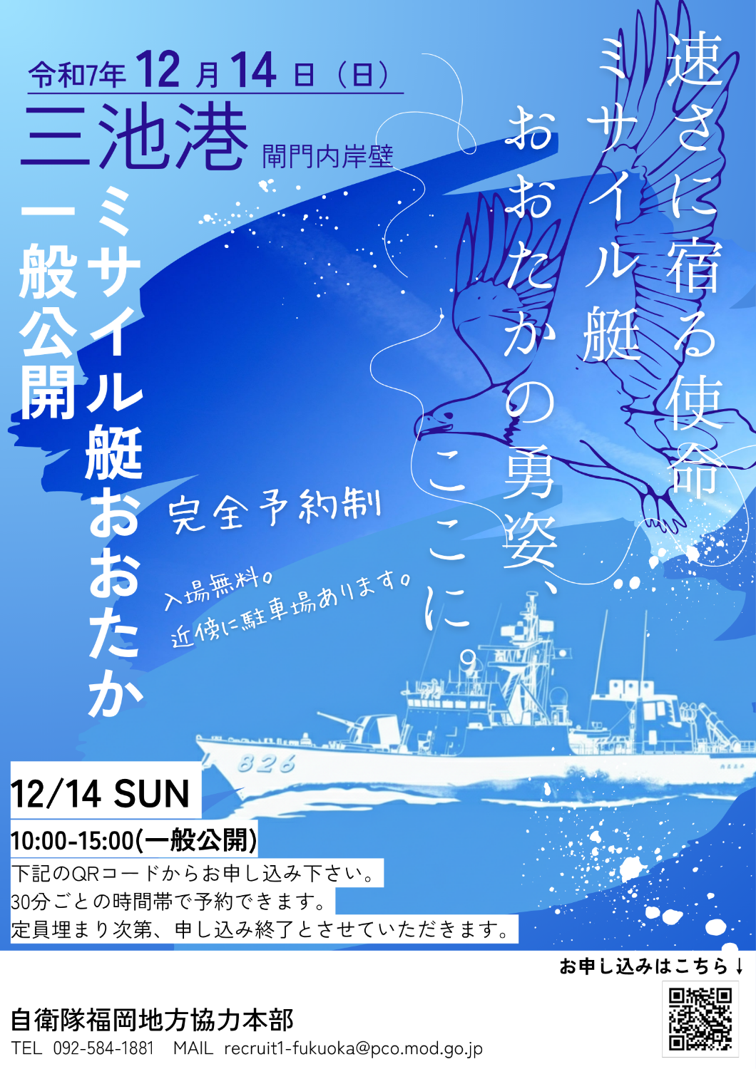 昨年、多くの来場があった海上自衛隊のミサイル艇「おおたか」が今年も一般公開されます。 ミサイル艇に乗艇できるほか、自衛隊の装備などの見学もできます。 入場は完全予約制となっております。 概要 開催日:2025/12/14(日)10:00〜15:00 開催場所:三池港 閘門内岸壁(福岡県大牟田市新港町) 入場料:無料 申込リンク:https://e-ve.event-form.jp/event/117441/chihaya